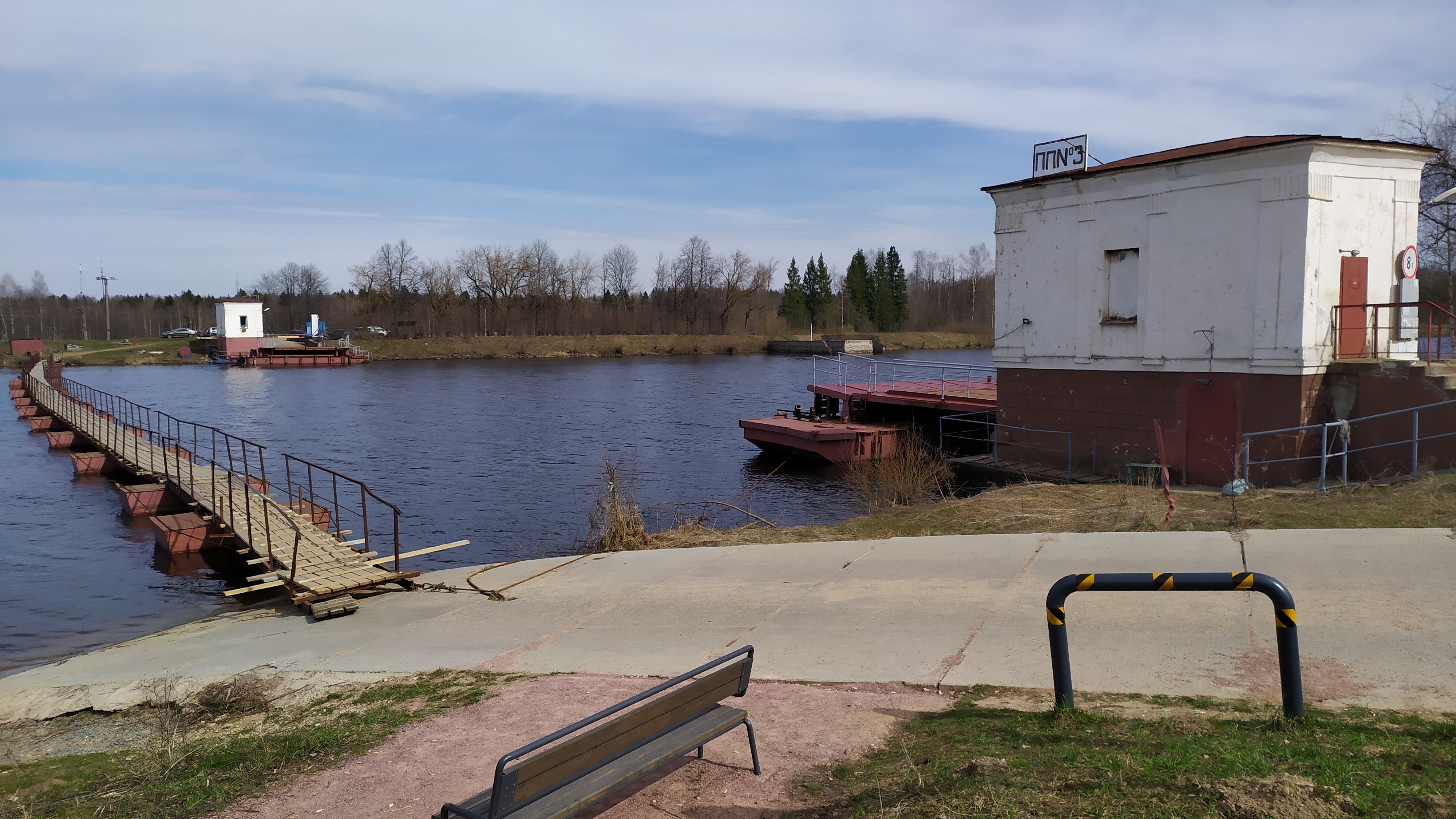 Паромная переправа еще не работает. Навигация не началась и вместо переправы через канал наведен пантонный мост. Для велосипедистов он бесплатный.