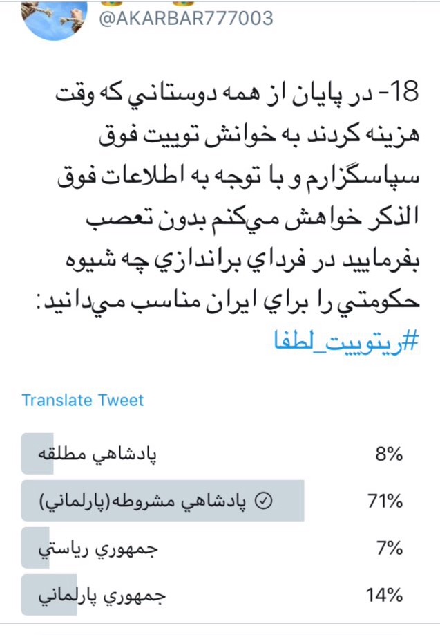 17- و در آخر قبل از شرکت در نظر سنجي از همراهان و دوستان عزیز تقاضا ميکنم به خوانش رشتوي ذیل👇 که لینکش پیوست گردید وقت هزینه کنند تا در یابند شیوه حکومتي جمهوري در ایران فاقد اصالت است و هیچ ریشۀ محکمي در ایران زمین ندارد👆