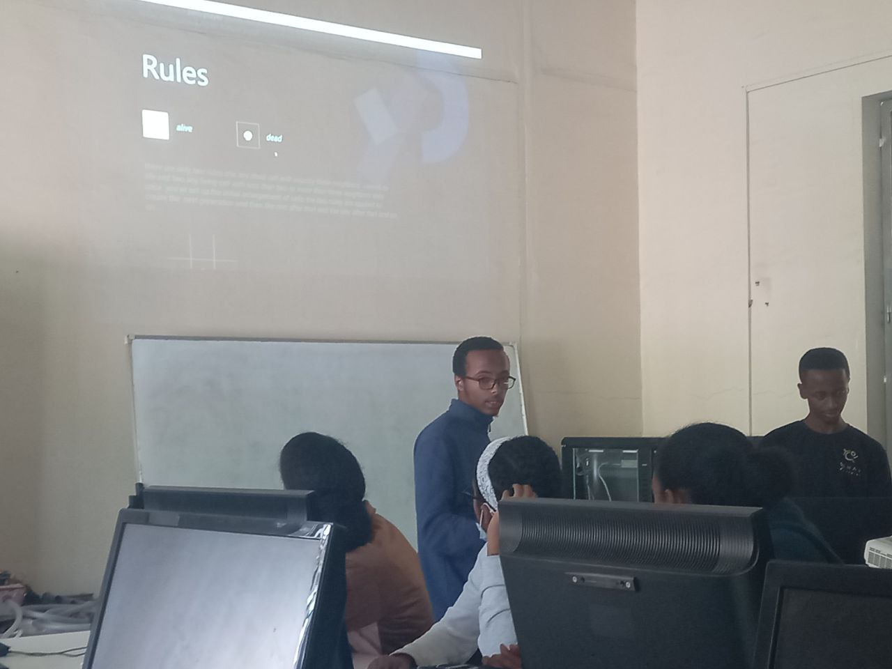The first workshop of PAI Day was led by Dawit, who before starting the coding session gave an introduction to Conway's "Game of Life" with an amazing presentation. He went on to explain the rules governing the simulation, which is a cellular automaton that follows simple rules to create complex patterns. Dave then proceeded to code the simulation using Processing. He walked the participants through the different steps involved in developing the simulation, explaining each piece of code and how it related to the rules of the game. We were able to follow along and observe how the patterns evolved on the screen. This workshop showed that basic principles of programming can be used to easily create dynamic and complex visual effects with Processing. By the end of the workshop participants were encouraged to explore & tinker with Processing's visual arts capabilities on their own.