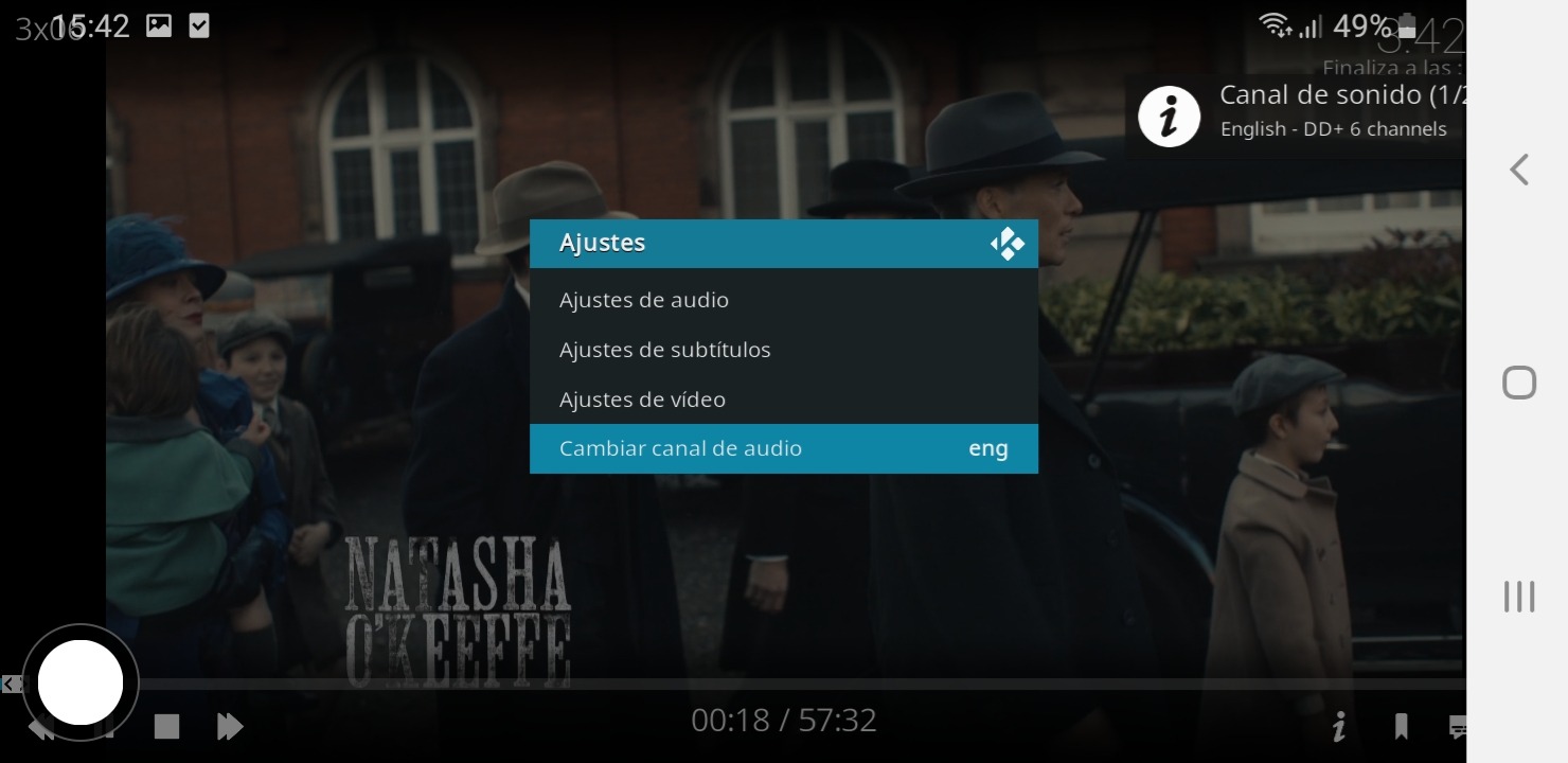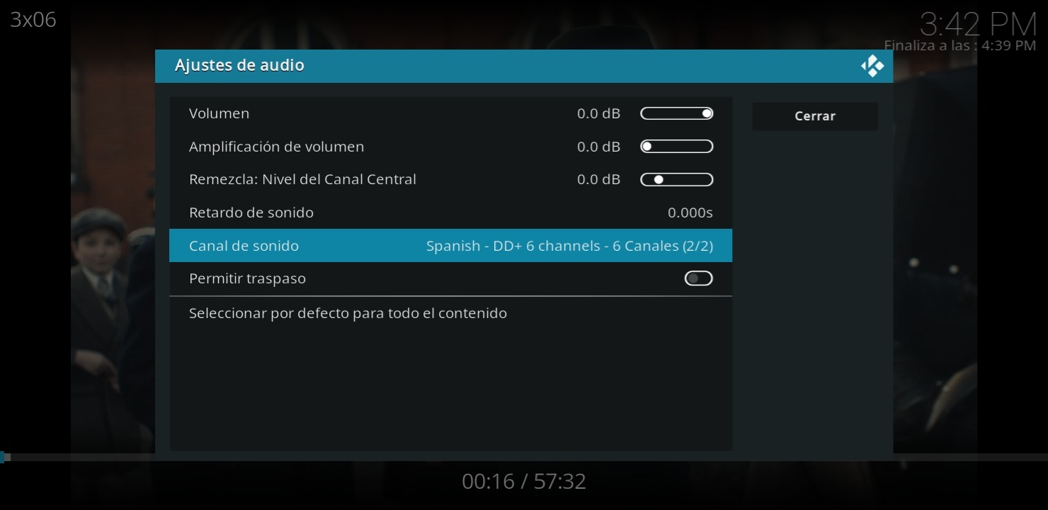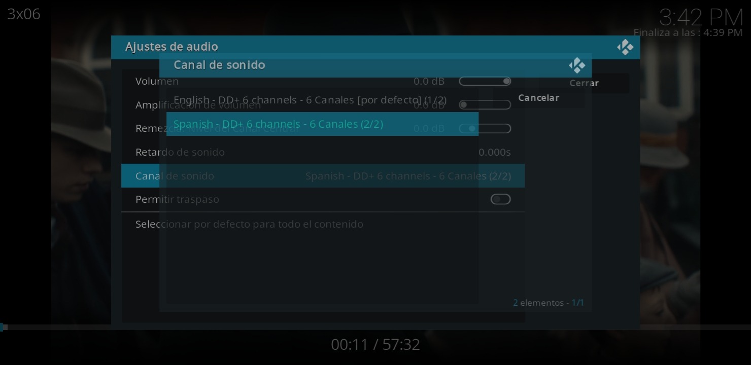 Para ello en cualquier momento de la reproducción le damos a la ⚙, después en la siguiente imagen, pulsamos en CANAL DE AUDIO.