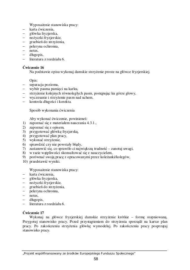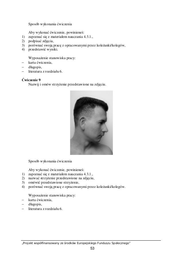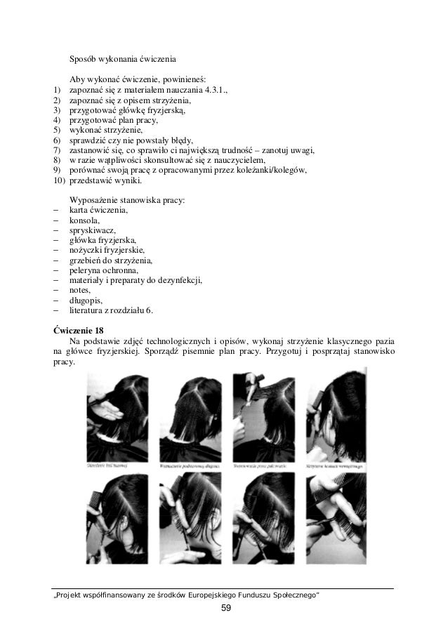 Sposób wykonania ćwiczenia Aby wykonać ćwiczenie, powinieneś: 1) zapoznać się z tekstem dotyczącym sposobów strzyżenia włosów, 2) przygotować stanowisko pracy, 3) wykonać cieczenie, 4) odpowiedzieć na pytania, 5) porównać swoje odpowiedzi z odpowiedziami opracowanymi przez koleżanki / kolegów .