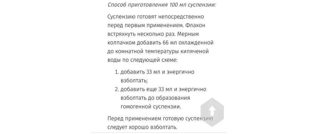 Суспензию готовят непосредственно перед первым применением . Флакон встряхнуть несколько раз . Мерным колпачком добавить 66 мл охлажденной до комнатной температуры кипяченой воды в 2 этапа и энергично взболтать после . . .