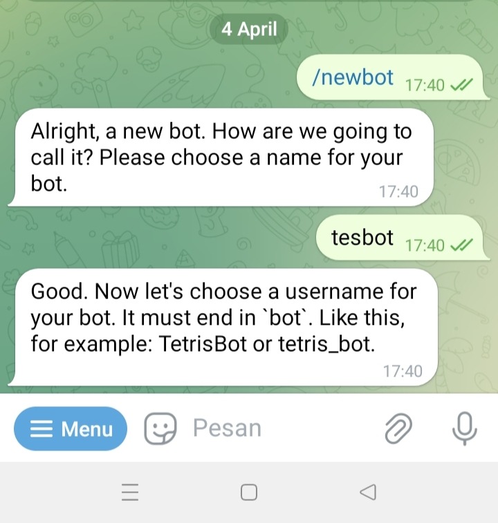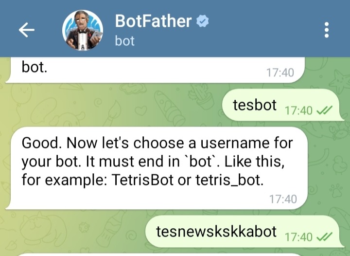 masukkan nama untuk bot, kemudian username (diakhiri dengan kata bot).
