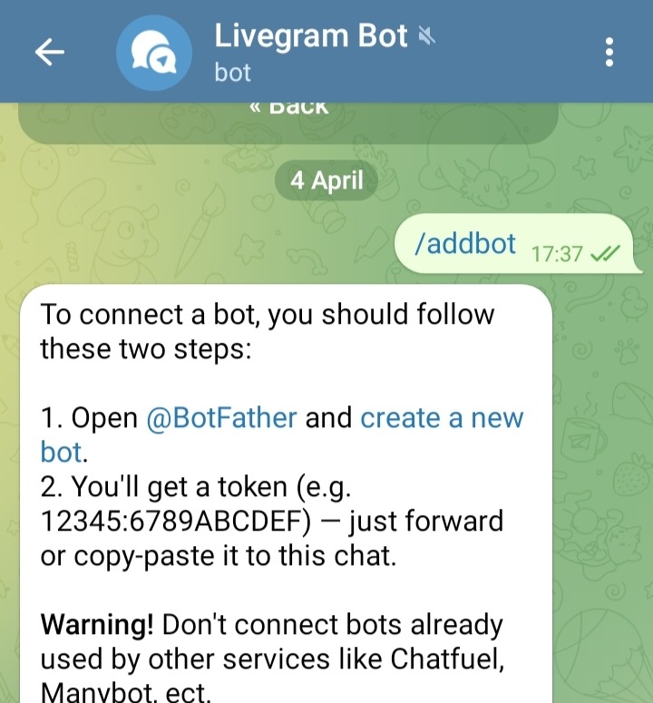 Setelah botfather memberikan token, beralihlah ke @livegrambot, kemudian klik perintah /addbot,