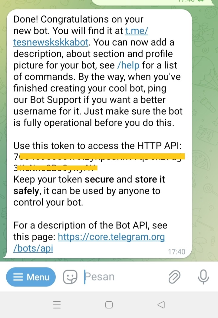 kemudian botfather akan memberikan token.