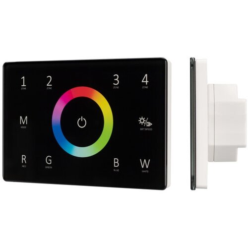 Dahili dokunmatik panel 2,4 GHz, siyah. İtalyan standardı. Malzeme - cam. RGBW ışık kaynaklarını (PWM) kontrol etmek için 4 kontrol bölgesi. DMX512 cihazları için kontrol fonksiyonu. Güç kaynağı/çalışma voltajı AC 85-265V. Boyutları 120x80x37 mm, standart priz kutusuna monte edilir. Panel SMART serisi kontrolörlerle uyumludur.