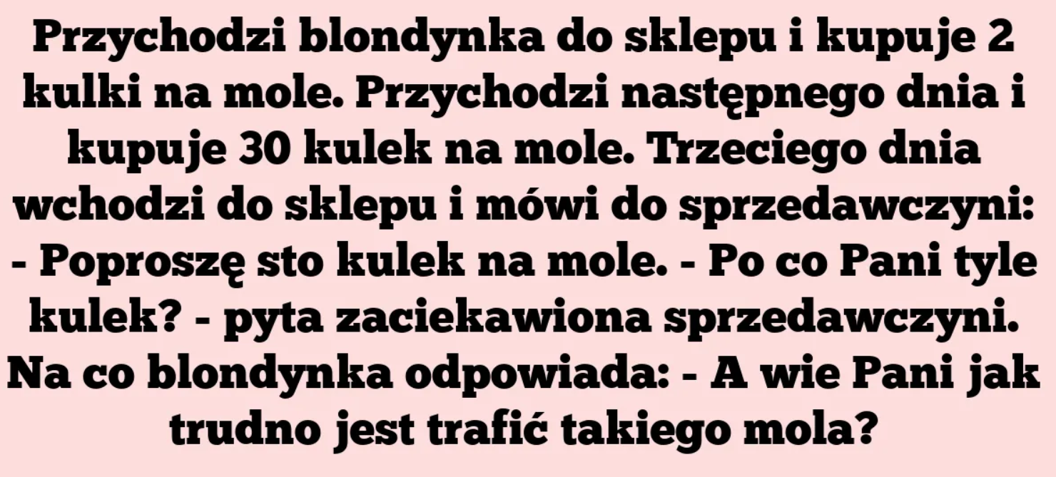- Jakie jest pani hobby? - Co to jest hobby? - pyta blondynka . - To jest to, co pani lubi najbardziej - odpowiada mężczyzna . - A . . . no to kapuśniaczek .