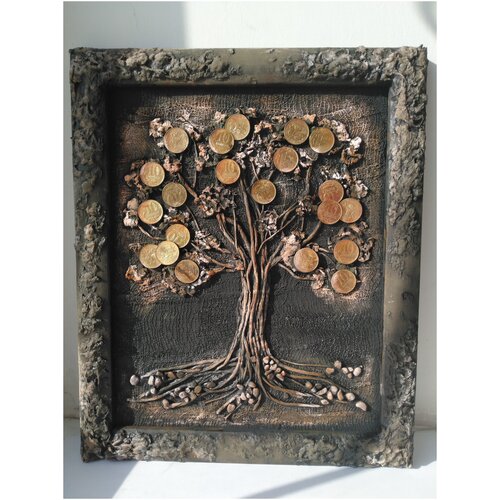 Le panneau de l'œuvre de l'auteur Money Tree 01 est réalisé selon la technique du papier mâché à l'aide de perles et de pièces de monnaie. Le panneau Money Tree est un symbole de richesse, de réussite et de prospérité. Le panneau peut être accroché au mur ou posé sur une table (sur une table). un stand). En regardant le panneau "Money Tree", personne ne restera indifférent. L’apparence des pièces attire l’attention de quiconque regarde ce panneau.