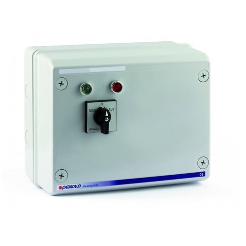 La télécommande est fournie dans un boîtier en thermoplastique auto-extinguible et protège l'électropompe des surcharges et des courts-circuits. Equipé d'un interrupteur pour le mode de fonctionnement manuel ou automatique (avec flotteur, pressostat, etc.) et conçu pour connecter des capteurs de niveau qui protègent la pompe du fonctionnement à sec. Température ambiante -5°C - 40°C avec une humidité relativement maximale de 50% Composants QST : Boîtier en plastique ignifuge, avec une plaque galvanisée sur le fond Compteur tripolaire situé en AC 3 Relais thermique réglable Électrodes (contre le fonctionnement à sec) Fusibles Indicateur lumineux Indicateur d'éclairage d'urgence Panneau à bornes Connecteurs