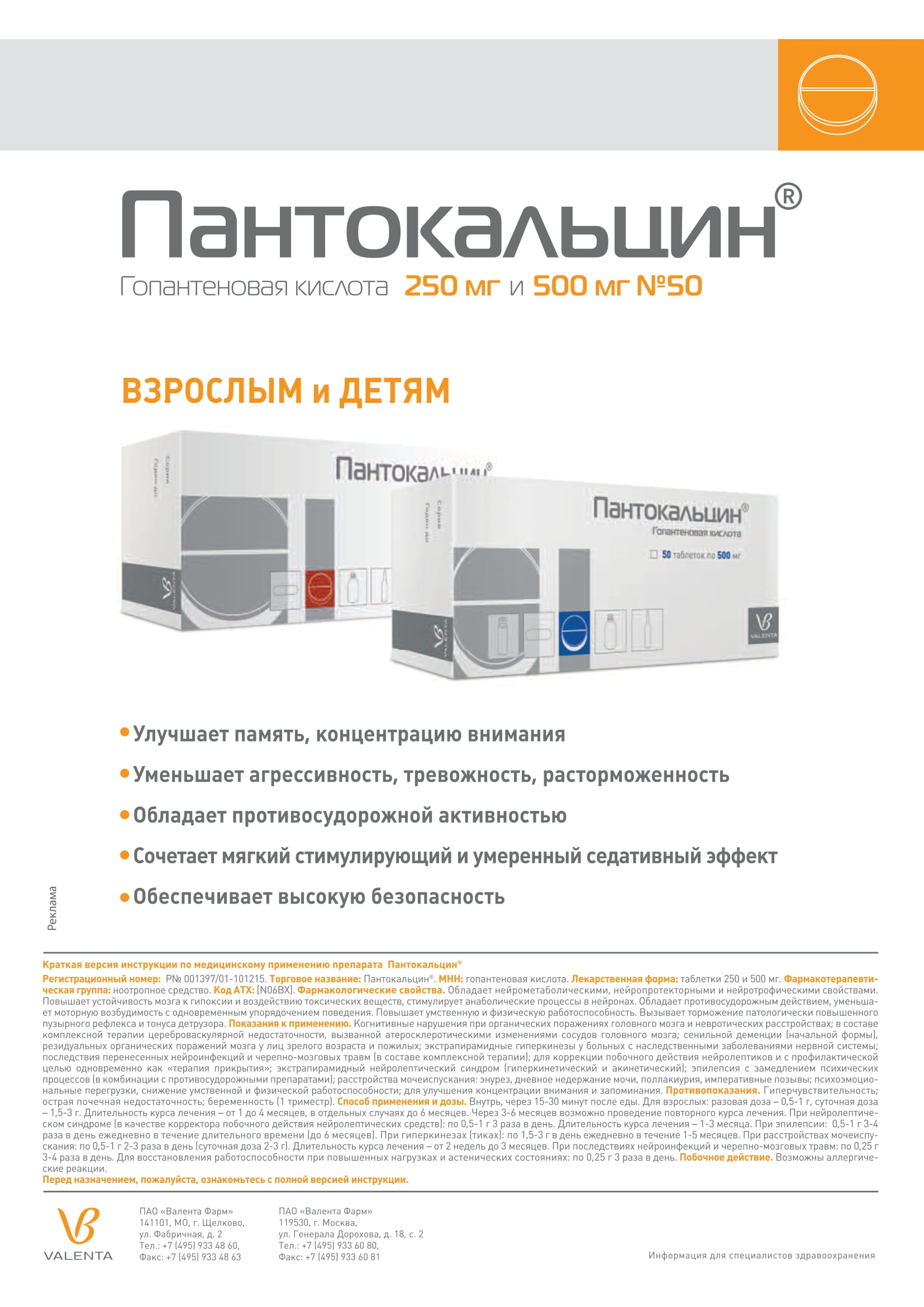 Пантокальцин улучшает биоэнергетические процессы и кровоснабжение головного мозга, повышает его устойчивость к гипоксии, обладает мембраностабилизирующим и церебропротекторным свойствами, что в сочетании с отсутствием выраженных побочных эффектов позволяет . . .