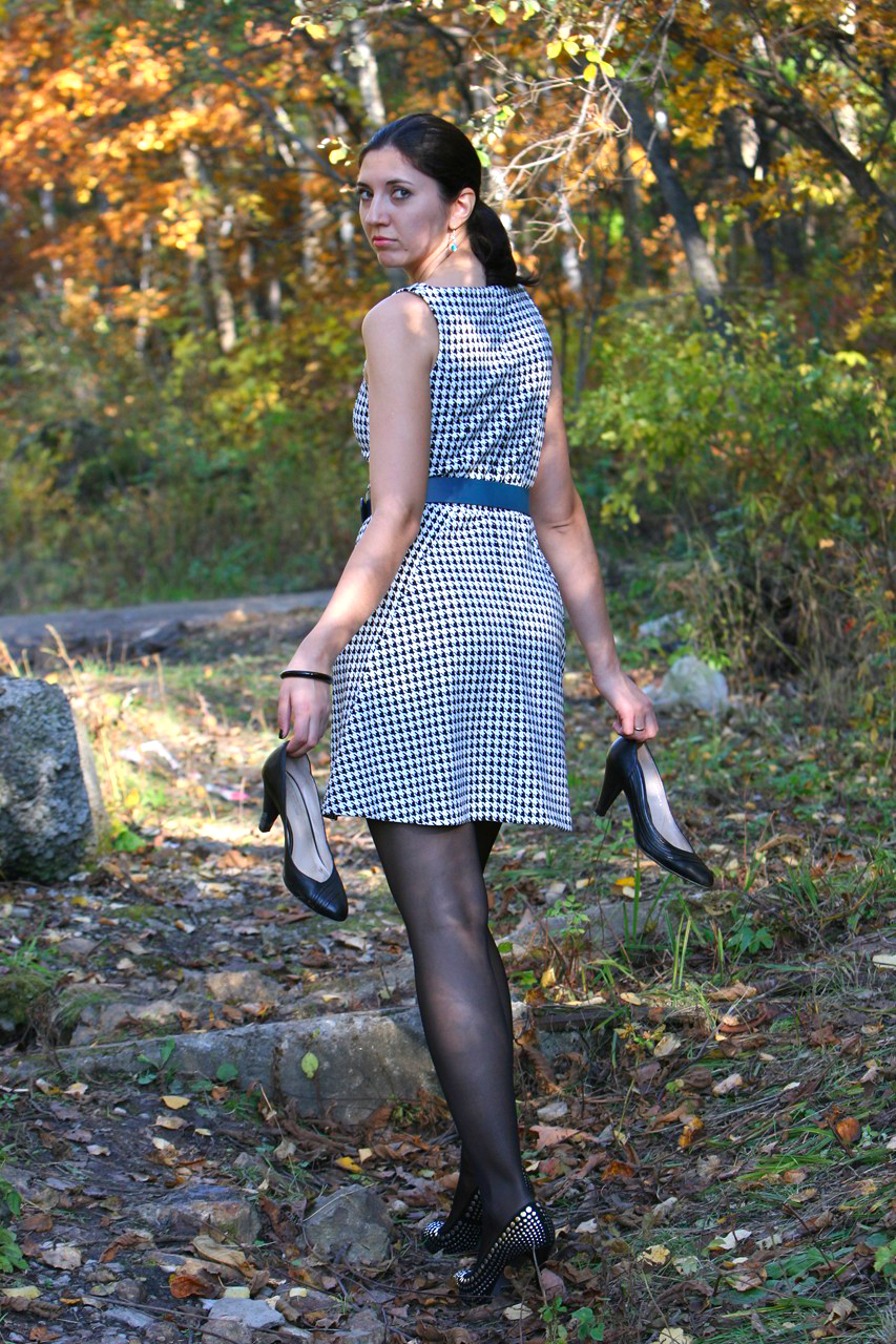 Sunny day , shiny pantyhose short elegant mini dress and high quality leather high heels are the perfect combination to make a video with our model.