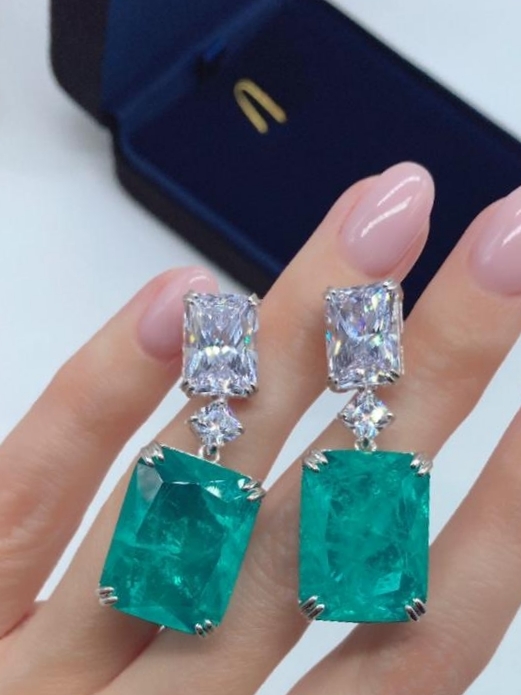 В серьгах на фото использованы овальные турмалины параиба, каждый из которых весит невероятные 23 карата . Оправой для них стали 120 крошечных бриллиантов и 112 таких же турмалинов параиба .