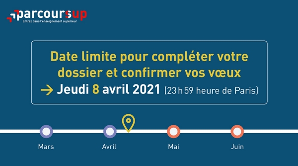 La date parcoursup limite pour exprimer vos voeux sera le Jeudi 11 mars, ainsi que pour les sous-vœux . Ca sera une occasion pour visiter un salon dédié à l'orientation ou de participer à des journées portes ouvertes pour vous faire une idée plus précise des cursus visés . Date limite pour compléter mon dossier Parcoursup : 8 Avril 2021