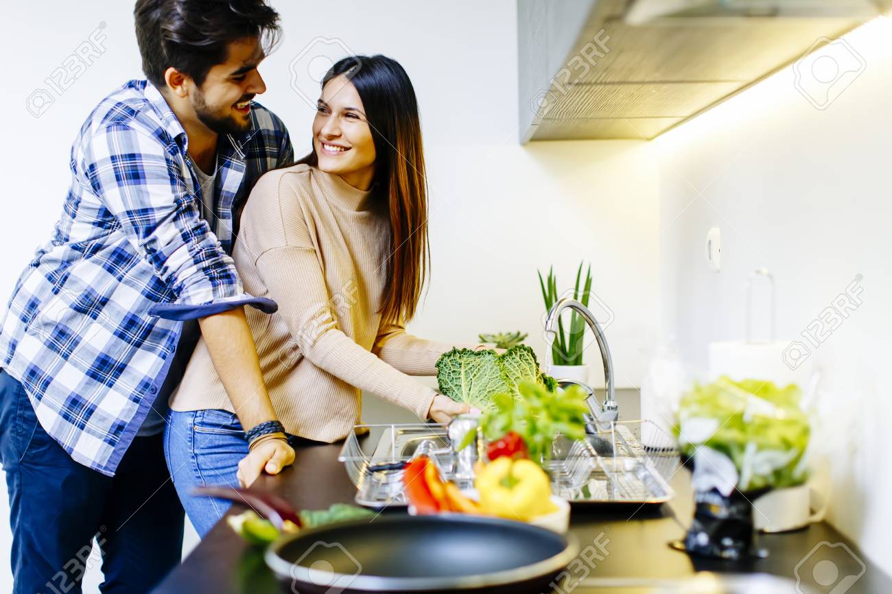 Feliz pareja de jóvenes se divierten en cocina moderna . . .