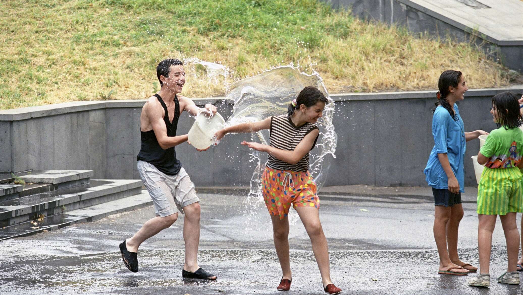 Парень обливает девушку водой
