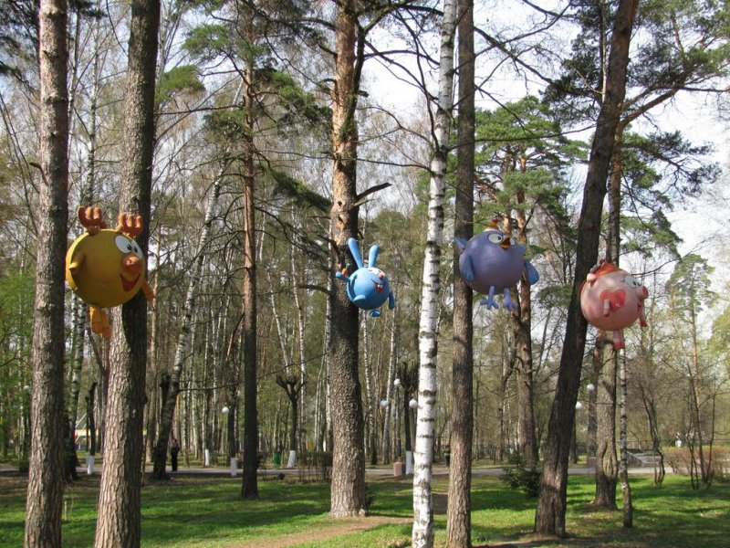 Ногинский парк культуры и отдыха . Аллея сказок в Ногинске . Прогулка по парку становится еще интереснее когда попадаешь на аллею сказок . Герои советских мультфильмов, сказочные персонажи, иностранный человек паук и даже губка боб висят на каждом дереве .