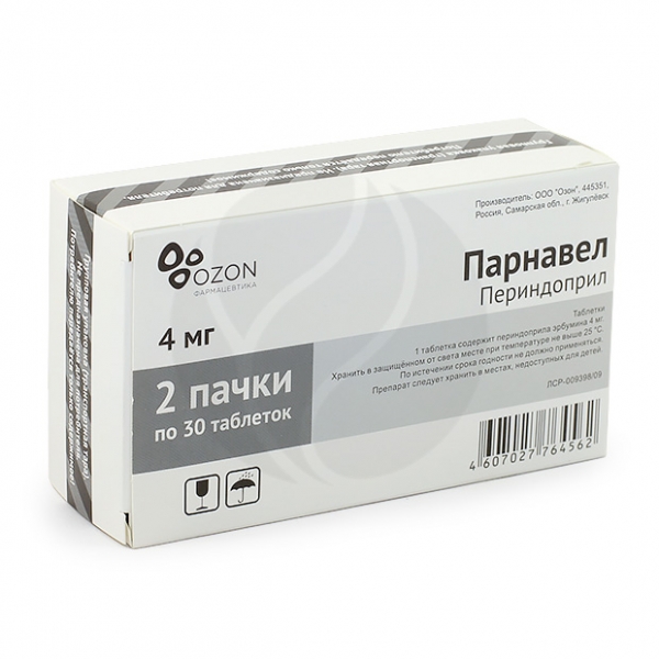 Парнавел — лекарственное средство из фармакологической группы гипотензивных препаратов . Оказывает гипотензивное действие, восстанавливает эластические свойства сосудистой стенки в крупных артериях, нормализует работу сердечной мышцы и уменьшает признаки гипертрофии миокарда . В каждой таблетке белого цвета содержится по 4 мг периндоприла .