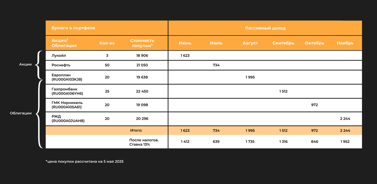 В правой части таблиц (где месяца) указан пассивный доход, который даст каждая бумага в конкретном месяце.