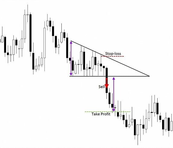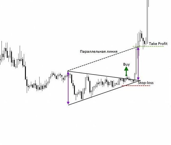 Стоп приказы. Для того, чтобы установить Take Profit, следует оценить “ширину” треугольника и отложить аналогичное количество пунктов от уровня ценового прорыва. Как вариант, трейдер может нарисовать линию, которая параллельна противоположной стороне фигуры. Таким образом мы увидим параллельный канал.