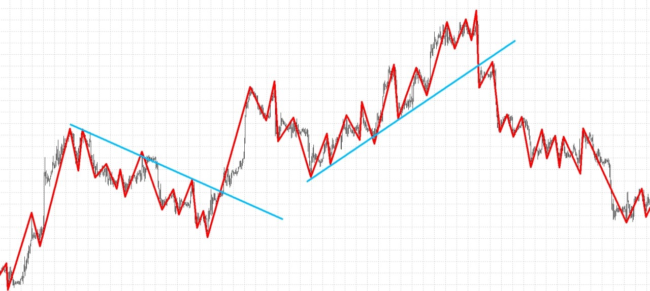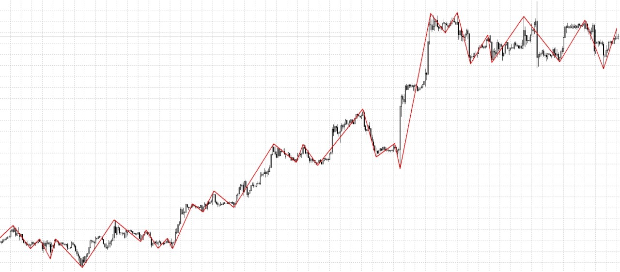 ZigZag строится следующим образом. На график наносятся условные точки, если цены разворачиваются не менее чем на заданную величину. Затем эти условные точки соединяются прямыми линиями.