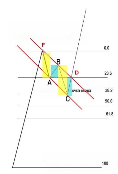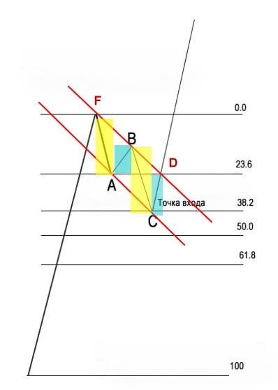 При движении В-С оно не должно пробивать или выходить за луч, проходящий через point В. Идеальной точкой входа будет пробитие лучем, проведенным от вершины флагштока (точка F), Фибо уровня, который следует за тем, где произошло касание point А и canal line. Позиция переводится в безубыточную, если цена пробила луч Эндрюса, исходящий из поинта В.