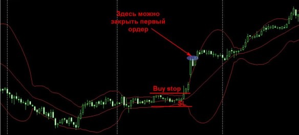 Отложенные ордера нужно установить на границах канала Боллинджера. После срабатывания одного второй следует удалить. Стоп-лосс - противоположная граница коридора. Рекомендуется входить в рынок двумя ордерами. Первый можно закрывать по окончании импульса, когда рынок успокоится. Для второго уместно использовать трейлинг-стоп, чтобы максимизировать прибыль от торговли.