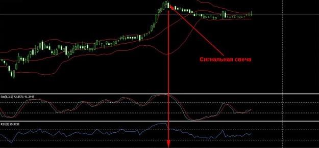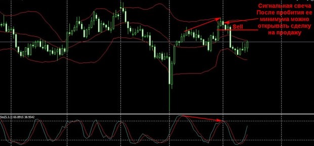 Сигнал на продажу появляется, когда цена выходит за пределы канала Боллинджера (пересекает вверх его верхнюю линию) и снова возвращается внутрь диапазона. Индикаторы Стохастик и RSI в это время находятся выше уровня 70 (в зоне перекупленности) и направлены вниз либо собираются пересечь его сверху вниз. Сигнальной свечой считается та, которая закрылась внутри канала Боллинджера.