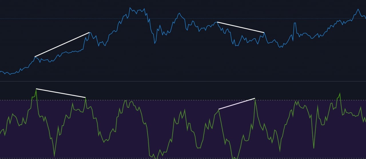 - Медвежья дивергенция: если цена BTC движется вверх по мере того, как индикатор ИДП движется вниз, существует медвежья дивергенция, сигнализирующая о том, что цена BTC может вскоре скорректироваться вниз;
