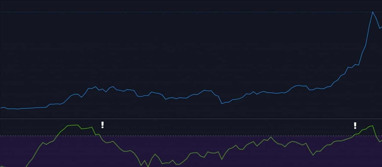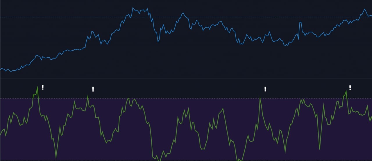 График цены BTC с индикатором ИДП внизу на четырехчасовом таймфрейме с восклицательными знаками, указывающими на условия перекупленности и перепроданности.