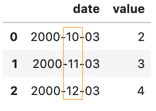 import pandas as pd from datetime import date date_from = pd .Timestamp(date(2003,1,1)) date_to = pd .Timestamp(date(2006,1,1)) # df is defined in the previous example df = df[ (df['date_of_birth'] > date_from ) & (df['date_of_birth'] < date_to) ] df . BEFORE: original dataframe . AFTER: only alice's date of birth is .