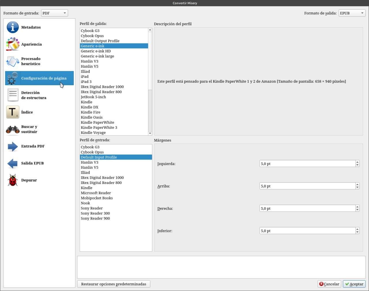 En la solapa configuración de página Calibre nos estandariza la convención si elegimos el tipo de dispositivo de lectura.