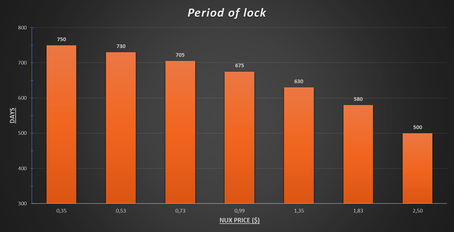 The NUX allocated for public sale is also locked, as well as presale tokens. But the process of releasing tokens will be slightly reduced. Instead of 750 days, tokens will be totally unlocked in 705 days. This depends on the final price of NUX: