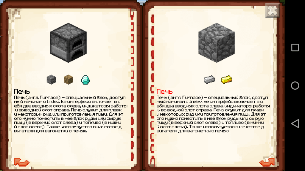 Работающая . dec: 62 hex: 3E bin: 111110 . Текстовый . идентификатор . furnace . Печь (англ . Furnace ) — специальный блок, доступный, начиная с Indev . Её интерфейс включает в себя два вводных слота слева, индикаторы работы и выводной слот справа . Печь служит для плавки некоторых руд или приготовления . . .