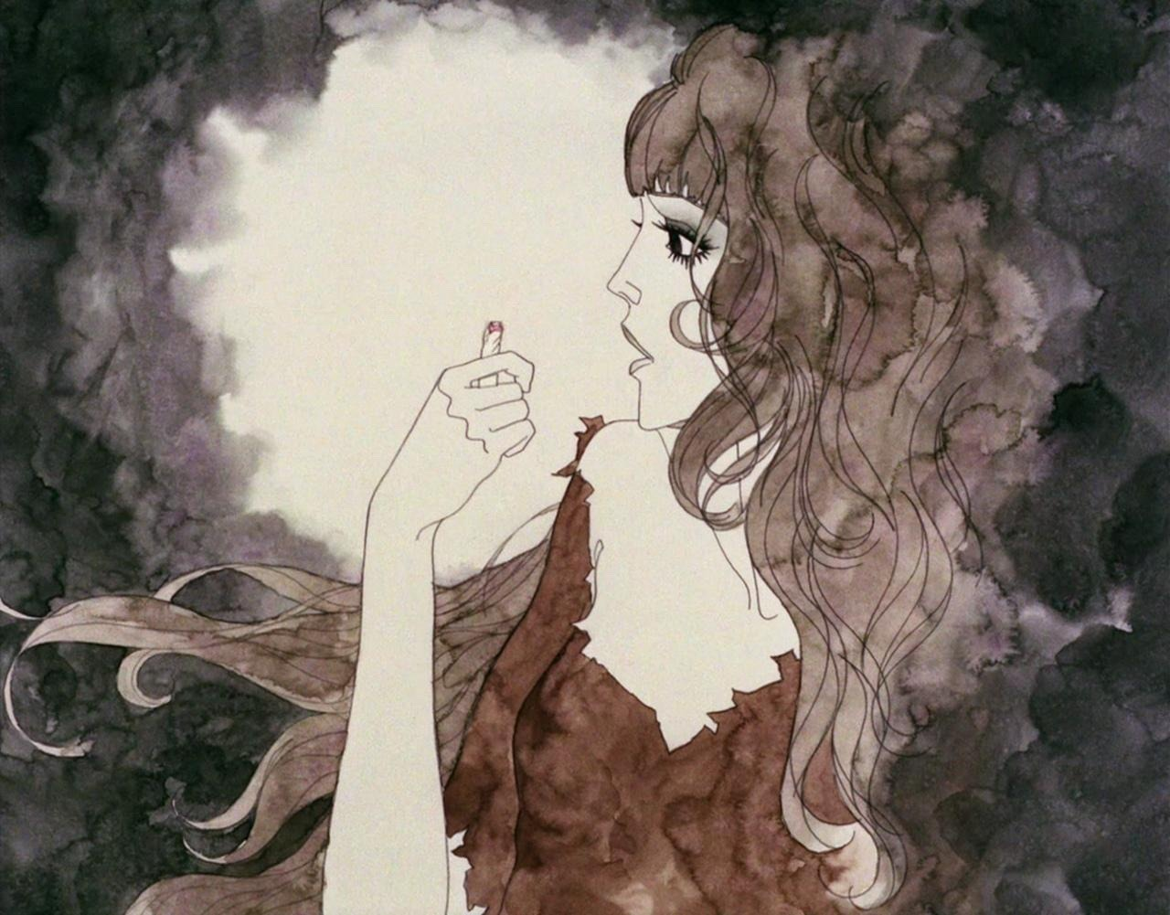 Несомненно, первое, на что обращаешь внимание, — невероятно стильное изображение. «Белладонна» — пример потрясающего визуала, где активно чередуются техники и материалы, чем компенсируется преимущественно слабая анимация — а то и её полное отсутствие. Большая часть фильма выполнена в статике, но это совершенно не портит впечатление. Благодаря живописной стилизации с обилием деталей, большинства кадров хочется рассматривать с особым вниманием — в идеале на паузе. С чем, кстати, помогает недавняя 4К-реставрация, для которой в том числе восстановили удаленные цензурой кадры.
