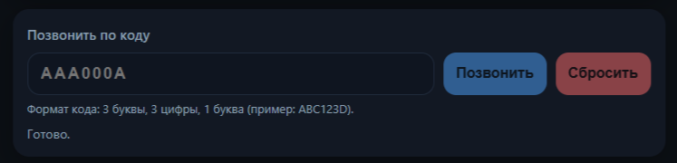 - И блок "Позвонить по коду" с областью ввода кода и кнопками "Позвонить" и "Сбросить"
