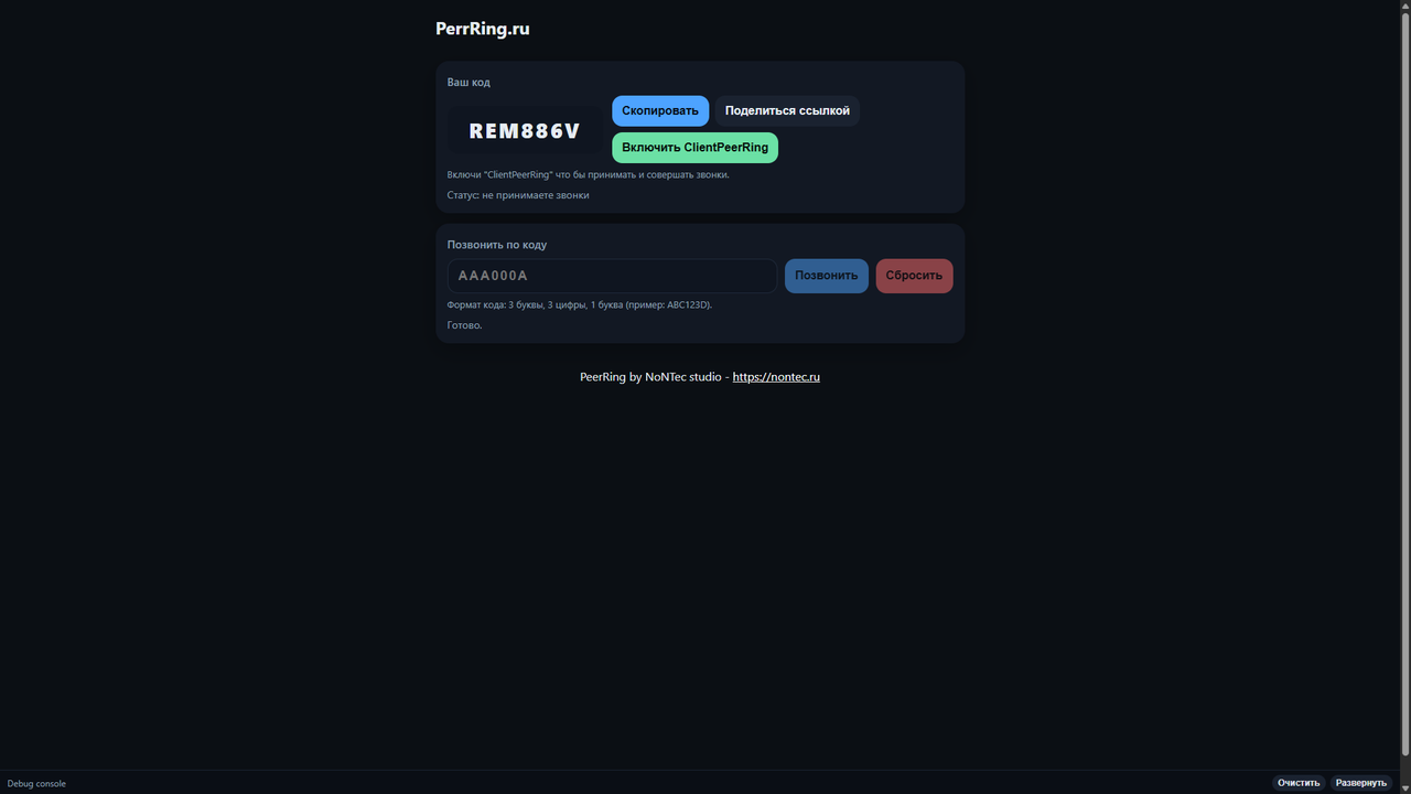 - Кнопки "Скопировать" (код), "Поделиться ссылкой" и "Включить/Выключить ClientPeerRing"