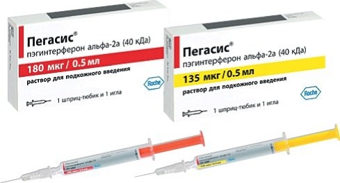 В одном флаконе препарата Пегасис находится 180 или 135 мкг альфа-2а пэгинтерферона . В одном шприц-тюбике препарата Пегасис находится 180 или 135 мкг альфа-2а пэгинтерферона .