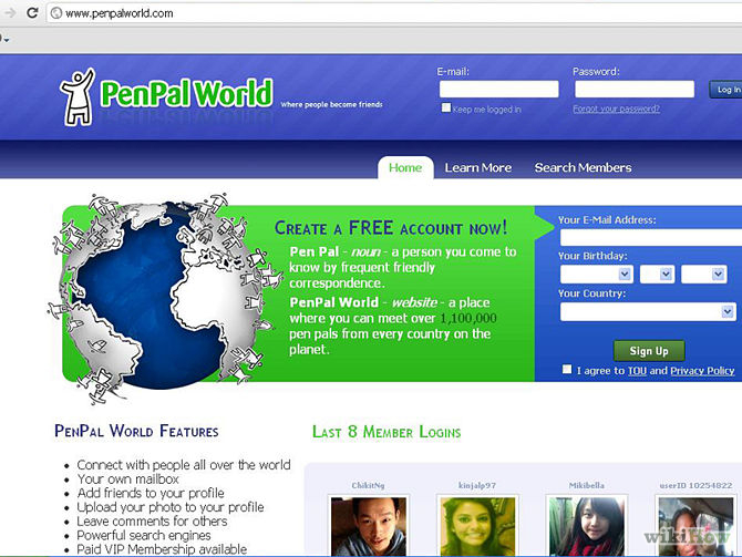 Create a FREE account now . Pen Pal - noun - a person you come to know by frequent friendly correspondence . PenPal World - website - a place where you can meet over 2,800,000 pen pals from every country on the planet . In order to sign up all we ask is your e-mail address, birthday, sex, and country .