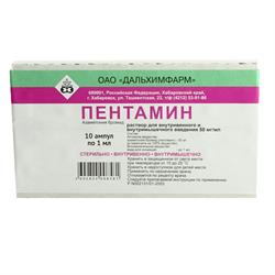 Пентамин - форма выпуска: 5% раствор в ампулах по 1 и 2 мл в упаковке по 6 и 10 штук . Пентамин - условия хранения: Список Б . В защищенном от света месте . Пентамин - синонимы: