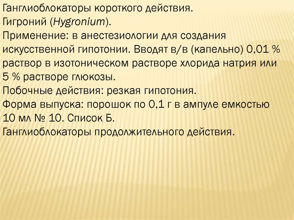 Пентамин - ганглиоблокирующее средство с гипотензивным, артерио- и венодилатирующим действием . Форма выпуска и состав Лекарственная форма Пентамина - 5% раствор для в/в и в/м введения . Действующее вещество препарата - азаметония бромид, его концентрация в 1 мл составляет 50 мг . Вспомогательный компонент - вода для инъекций .