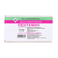 Форма выпуска и состав . Выпускают Пентамин в форме раствора для внутривенного и внутримышечного введения (по 1 мл в ампулах; 5 ампул в упаковках ячейковых контурных; 1 упаковка в пачке картонной, 10 ампул в коробке картонной) . В 1 мл раствора содержится активное вещество . . .