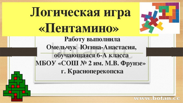 Предлагаем вашему вниманию игру головоломку «Пентамино», изготовленную своими руками . Автором «Пентамино» является американский математик, изобретатель головоломок и занимательных задач С . В . Готлиб .