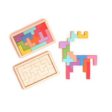 Это самая распространённая задача в пентамино — сложить из всех фигурок, без перекрытий и зазоров, прямоугольник . Поскольку каждая из 12 фигур включает в себя 5 квадратов, то прямоугольник должен быть площадью 60 единичных квадратов . Возможны прямоугольники 6×10, 5×12, 4×15 и 3×20 . А это карточки задания для малышей .