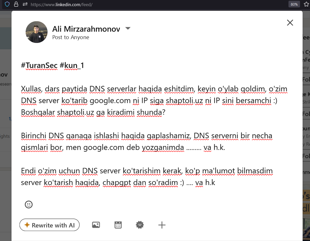 Challengeda qatnashmoqchiman, qatnashish uchun Linkedin profilim - havola.