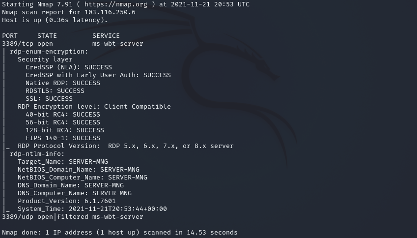 sudo nmap -p 3389 -sU -sS --script rdp-enum-encryption,rdp-ntlm-info,rdp-vuln-ms12_020 103.116.250.6