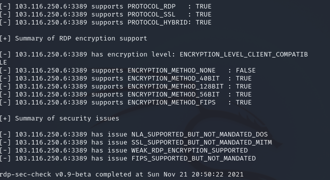 Инструмент rdp-sec-check проверяет, какие используются алгоритмы шифрования и методы аутентификации, а также некоторые другие настройки безопасности. В конце проверки rdp-sec-check подводит краткий итог о возможных проблемах безопасности службы удалённого рабочего стола.