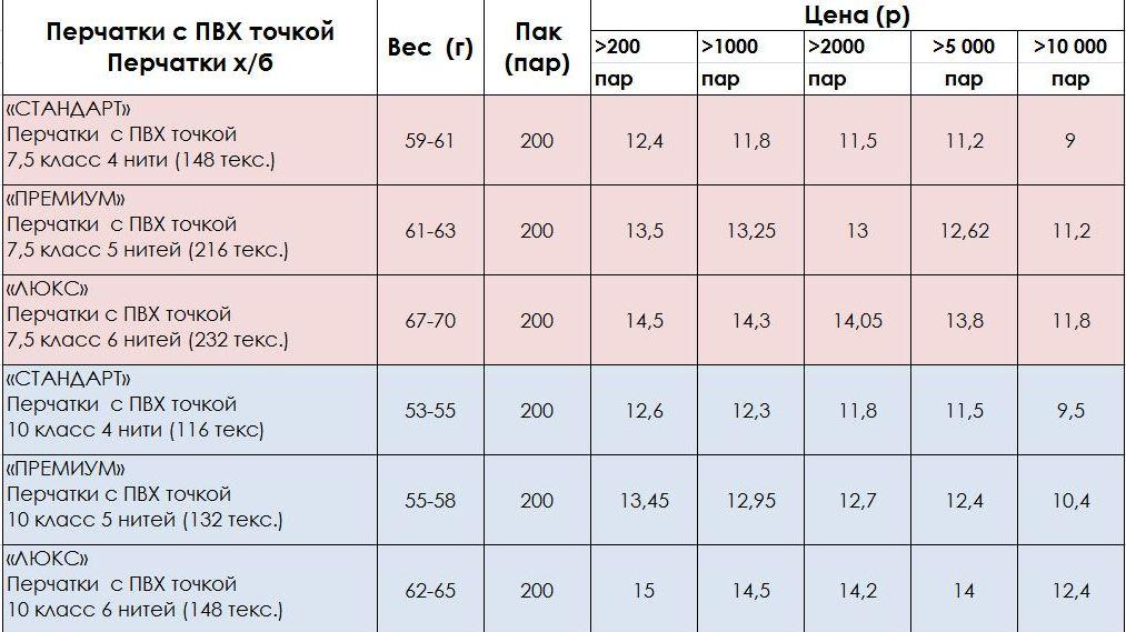 Перчатки х б с пвх размеры