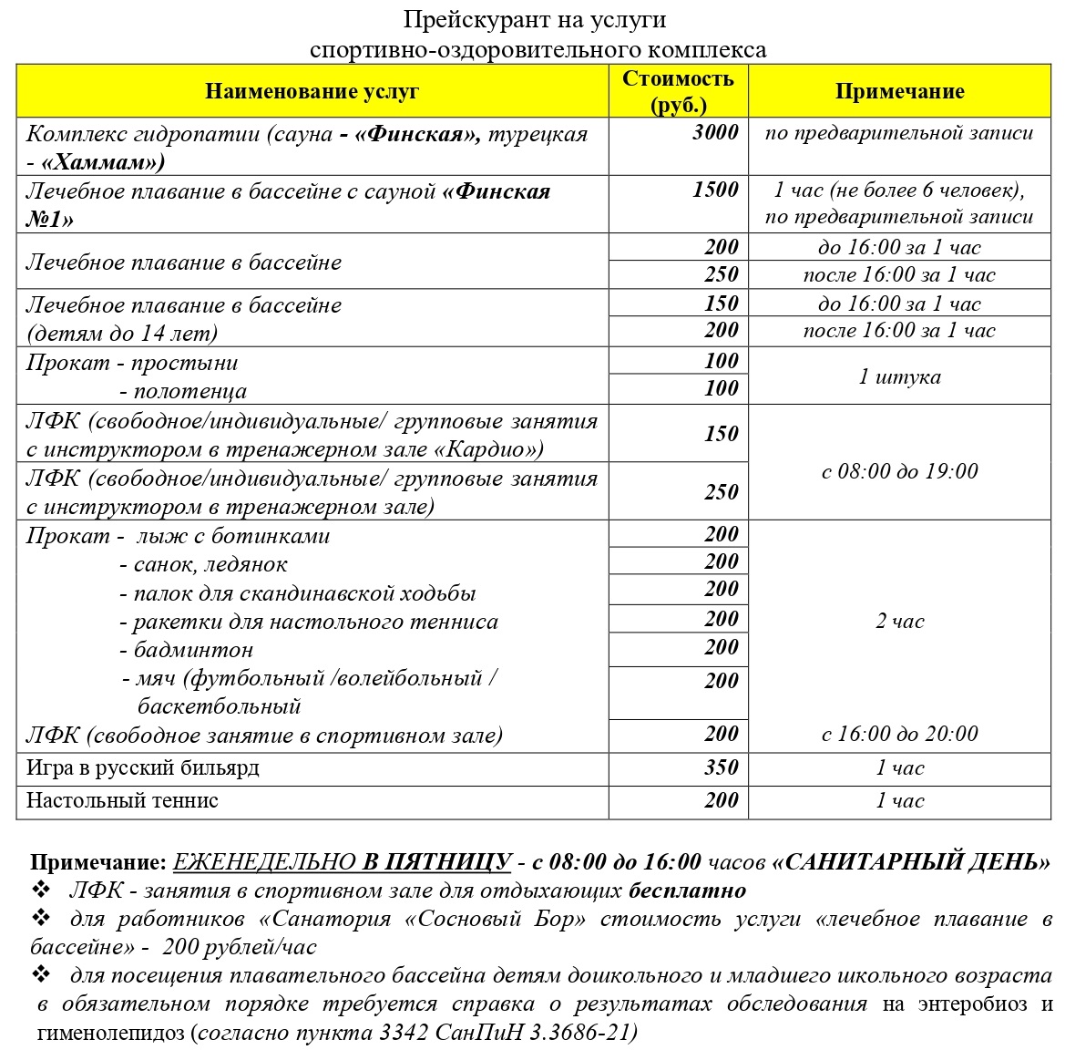 Перечень услуг спорт