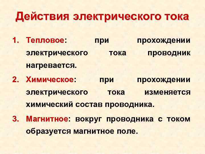 Перечислить действия тока